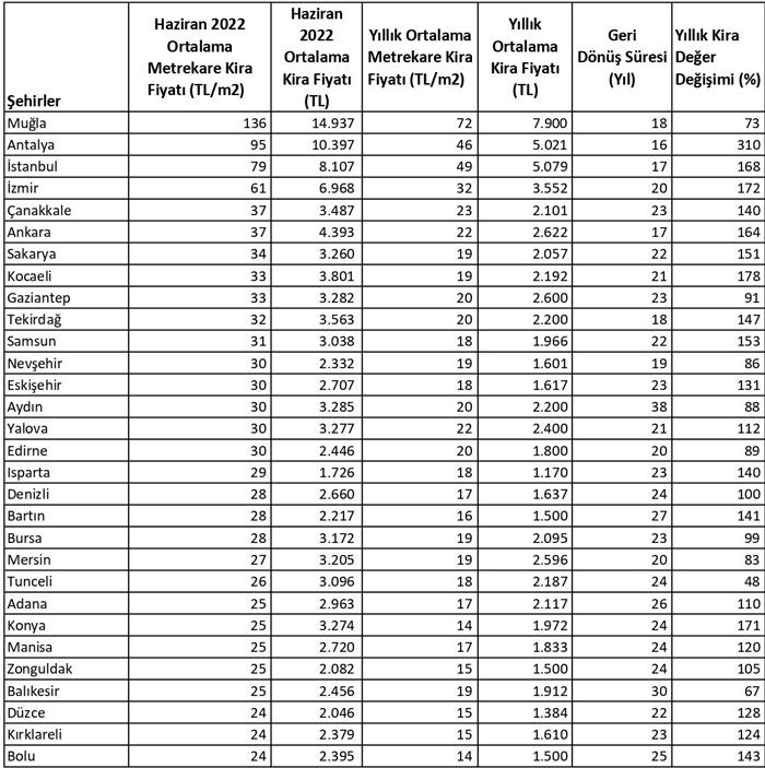 Türkiye genelinde kira bedeli en yüksek olan iller sırasıyla Muğla, Antalya ve İstanbul oldu. Muğla’da kiralarda yıllık değer artışı %73 seviyesinde, ortalama metrekare kira 136 TL, ortalama kira 14 bin 937 TL, geri dönüş süresi ise 18 yıl oldu. Antalya’da kiralar son 1 yılda %310 artış gösterdi. Ortalama metrekare kira 95 TL, ortalama kira 10 bin 397 TL, geri dönüş süresi ise 16 yıl.