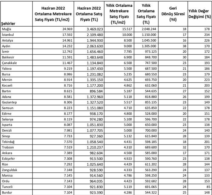 Türkiye genelinde Haziran ayı itibarıyla konut satış fiyatlarında yıllık değer artışı %182 olarak gerçekleşti. Haziran ayında ortalama metrekare konut satış fiyatına göre ilk 30 il değerlendirildiğinde yıllık değer artışı en yüksek olan iller ise sırasıyla İstanbul, Antalya ve Mersin oldu. İstanbul’da konut fiyatları son bir yılda %234 artış gösterirken, ortalama konut metrekare satış fiyatı 17 bin 592 TL, ortalama konut satış fiyatı 2 milyon 109 bin 480 TL oldu. Antalya’da yıllık değer artışı %226, ortalama konut metrekare satış fiyatı 14 bin 961 TL, ortalama konut satış fiyatı 1 milyon 944 bin 930 TL olurken, Mersin’de ise yıllık değer artışı %223, ortalama konut metrekare satış fiyatı 8 bin 914 TL, ortalama konut satış fiyatı 1 milyon 335 bin 150 TL oldu.