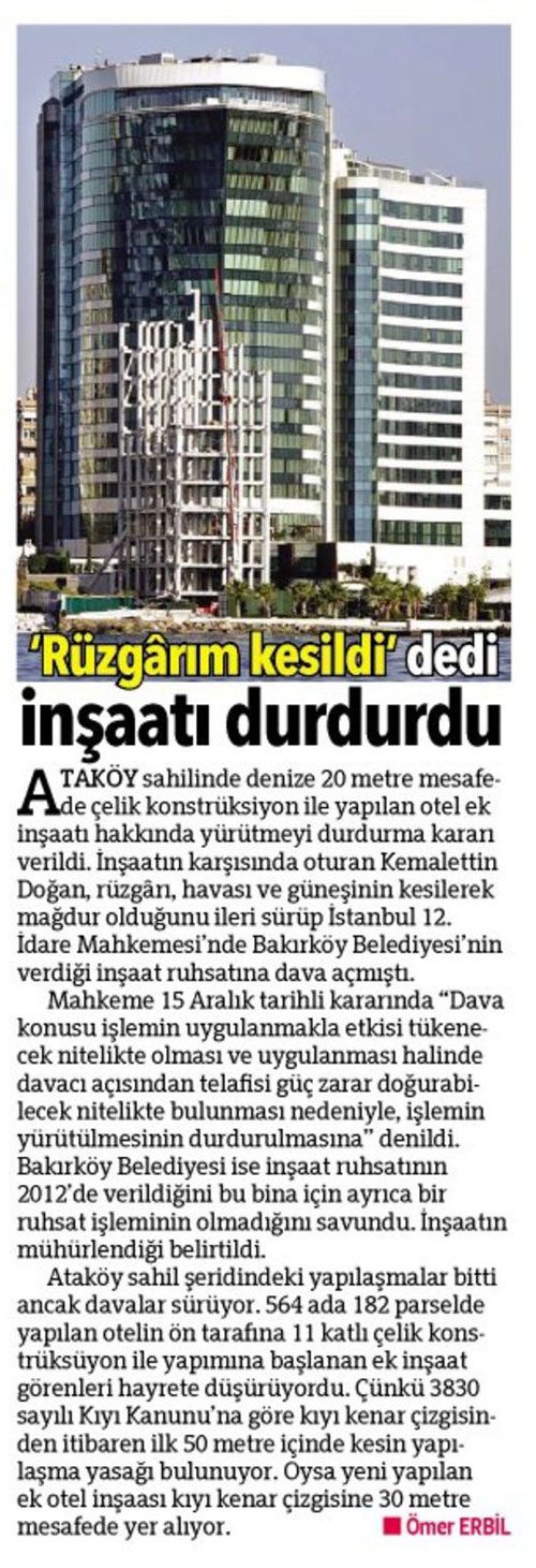 Yapılan incelemelerde ise Ataköy sahilinde denize 20 metre mesafedeki çelik konstrüksiyonlu 11 katlı otel ek inşaatı zaten görenleri hayrete düşürüyordu. Çünkü 3830 sayılı Kıyı Kanunu’na göre kıyı kenar çizgisinden itibaren ilk 50 metre içinde kesin yapılaşma yasağı bulunuyor. Oysa yeni yapılan ek otel inşası kıyı kenar çizgisine 30 metre mesafede yer alıyor.