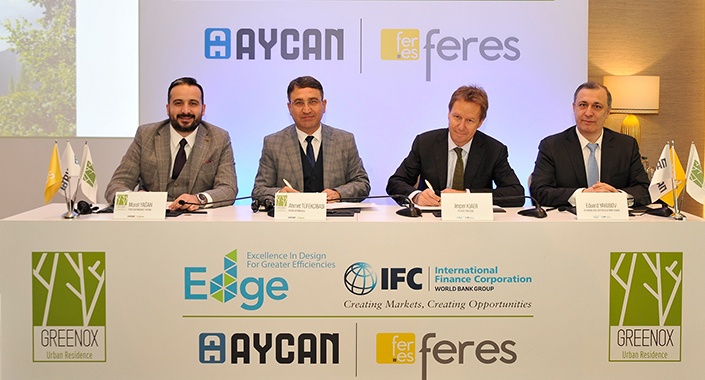 Greenox’un EDGE Yeşil Bina Sektörel Gelişim Programı kapsamında pilot proje seçilmesine ilişkin imza töreni Aycan Gayrimenkul Başkanı Ahmet Tüfekçibaşı, Feres Gayrimenkul Yatırım Ortağı Murat Yağan, Aycan & Feres İş Ortaklığı Yönetim Kurulu Üyesi ve Proje Konsept Mimarı Salih Çıkman, IFC Ülke Yöneticisi Jesper Kjaer, IFC Kıdemli Özel Sektör Geliştirme Uzmanı Eduard Yakubov ve IFC Yeşil Binalar Danışmanı Naz Beykan’ın katılımıyla gerçekleştirildi.