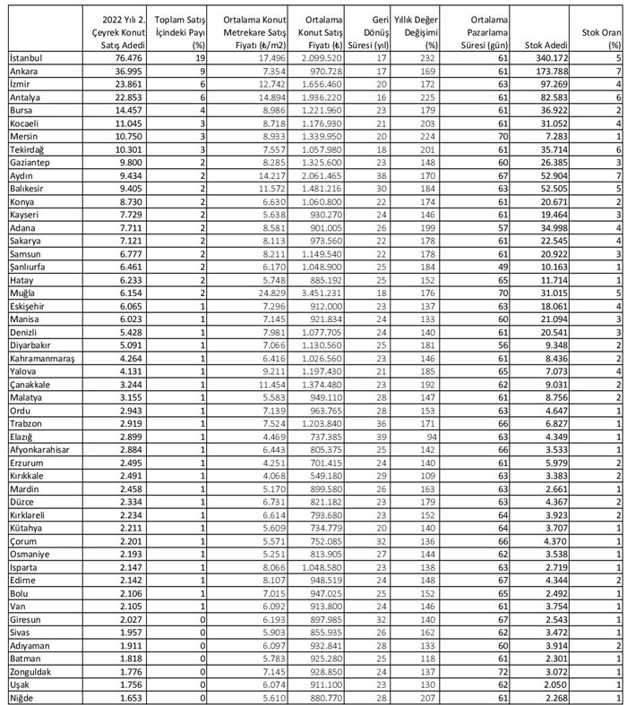 En fazla konut satışı olan 50 il içerisinde en fazla değer artışı olan iller sırasıyla İstanbul, Antalya ve Mersin oldu. İstanbul’da yıllık değer artışı %232, ortalama konut metrekare satış fiyatı 17 bin 496 TL, ortalama konut fiyatı 2 milyon 99 bin 520 TL, Antalya’da konut fiyatları son bir yılda %225 artış gösterdi. Ortalama konut metrekare satış fiyatı 14 bin 894 TL, ortalama konut satış fiyatı 1 milyon 936 bin 220 TL, Mersin’de yıllık değer artışı %224, ortalama konut metrekare satış fiyatı 8 bin 933 TL, ortalama konut satış fiyatı 1 milyon 339 bin 950 TL oldu.