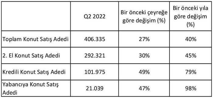 2022 yılının 2. çeyreğinde 406 bin 335 adet konut satışı gerçekleşti. Konut satış adedi bir önceki çeyreğe göre %27; geçen senenin aynı dönemine göre ise %40 artış göstermiş oldu.