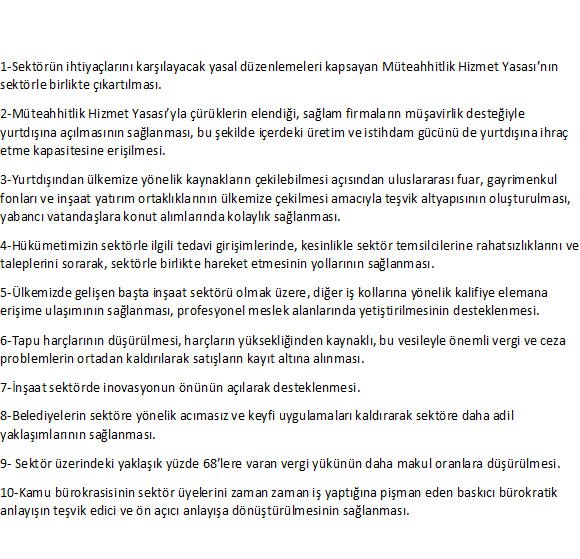İnşaat sektörünün yavaş yavaş ivme kaybettiğini ve hükümetle sektör temsilcileri arasındaki iletişim kopukluğundan dolayı bu durumun günden güne daha vahim duruma geldiğini dile getiren Tellioğlu “Söz konusu bu durum neticesinde hükümet hastaya, hastalığını sormadan kendisine göre koyduğu teşhislerle tedavi yoluna gitmek istediği için, hasta açısından yani sektör açısından maalesef iyi neticeler ortaya çıkmıyor” dedi. Türkiye’deki konut satışlarının “durdu” denilecek seviyeye yaklaşmasının temel sebeplerinden birinin de önüne gelenin müteahhit olmaya kalkmasından kaynaklandığı söyleyen Tahir Tellioğlu, aşırı imar artışlarından kaynaklı aşırı konut üretim olduğuna da işaret etti. Bu şekilde inşaat sektörünün sürdürülebilir bir kapasite olmaktan uzaklaştığını kaydeden Tellioğlu, inşaat ve konut sektöründeki sürdürülebilirliğin yeniden etkin hale gelebilmesi için sektör adına en azından 10 maddelik bir çözüm paketinin ivedilikle çıkartılması gerektiğini söyledi.