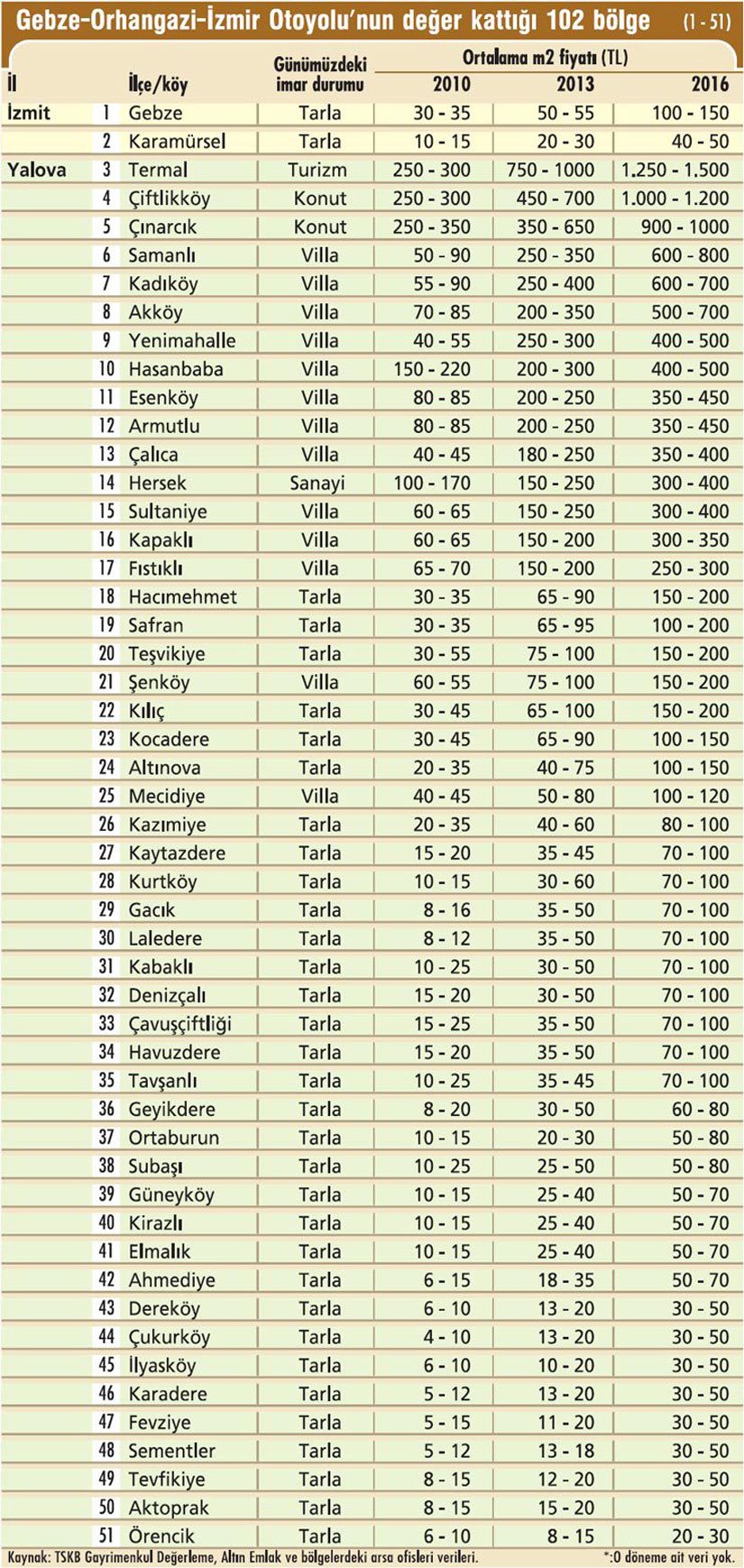 Yaptığımız detaylı araştırmaların sonucunda n Gebze-Orhangazi-İzmir Otoyolu üzerinde en ciddi artış Yalova Termal bölgesinde görülürken onu Çiftlikköy ve Çınarcık gibi ilçeler izliyor. Bu bölgelerin değer kazanmasında konut ve turizm imarlı arsaların çokluğu etkili olurken özellikle Arap yatırımcıların fiyatların artmasında etkili olduklarına dikkat çekiliyor.