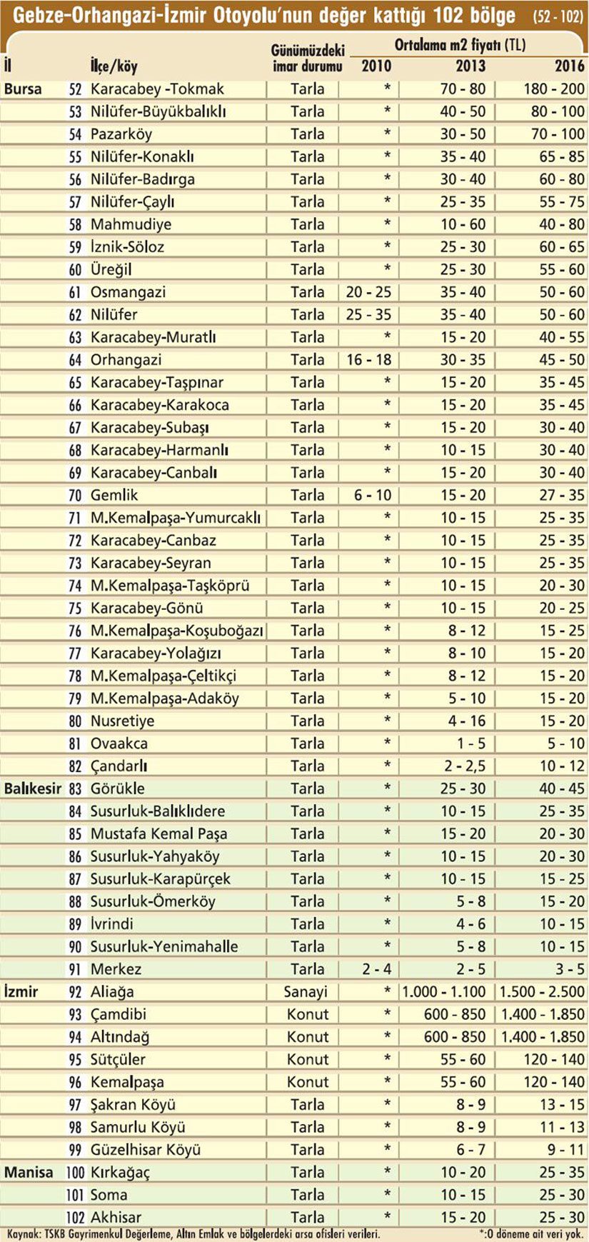 Gebze’den başlayıp Osman Gazi Köprüsü’nden Yalova, Bursa, Balıkesir, Manisa kentlerini takip ederek İzmir’e inen otoyol üzerindeki araziler kimi yerlerde dört katına varan oranlarda değerlenmiş durumda. Şu anda Yalova ve Bursa’nın köylerinde ciddi bir hareketlilik gözlenirken, Gebze-Orhangazi-İzmir Otoyolu’nun, 2019’da açılmasıyla birlikte Manisa ve İzmir civarındaki arazilerin değer kazanması bekleniyor. Yolun açılmasıyla hat üzerinde alışveriş zonlarının oluşturulması da uzun vadeli beklentiler arasında…