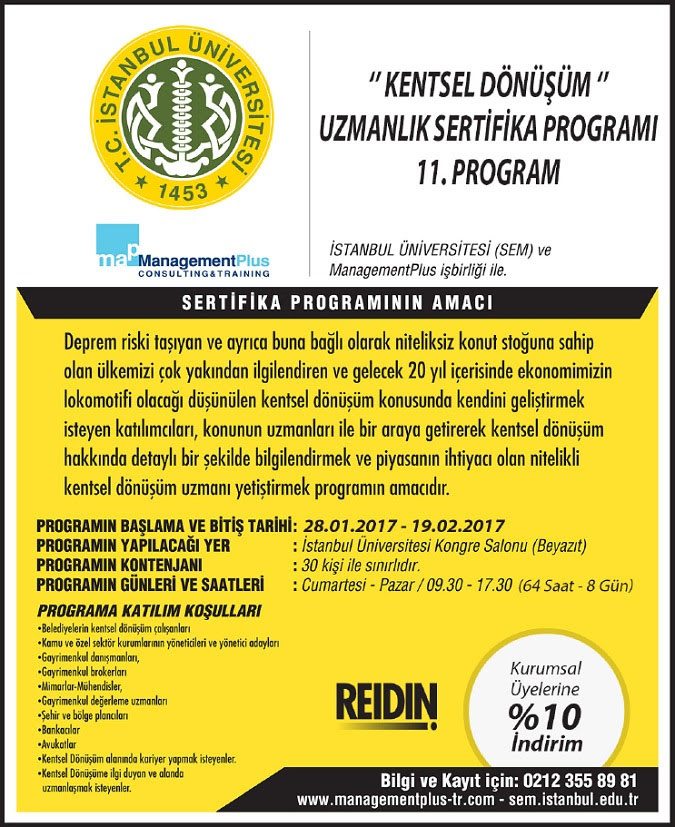 Kentsel dönüşüm süreci içinde fiilen çalışan çok önemli uygulamacı hocalar tarafından verilen ve dersler toplam 8 günde 64 saat olarak programlandı. Derslerin İstanbul Üniversitesi Beyazıt Kampüsü’nde işleneceği sertifika programına sadece 30 kişi katılabilecek.
