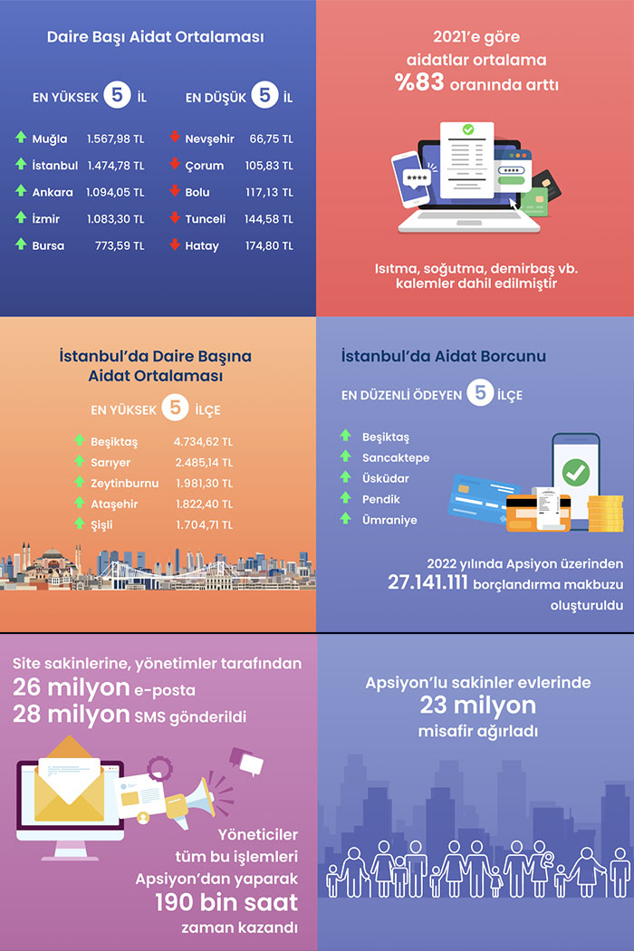 Site yönetimlerinin en çok harcama yaptığı gider kalemlerinin; doğal gaz, su, elektrik, güvenlik görevlisi ve temizlik personeli olduğunu belirten Apsiyon CEO’su Kudret TÜRK, “2022 yılında site yönetimleri, Apsiyon üzerinden yaklaşık 125 milyon işlem yaptı. Site sakinlerinin açtığı 228 bini aşkın iş talebinin %96’sı ise çözüme kavuşturuldu. Platformumuzdan 26 milyon e-posta ve 28 milyon SMS gönderildi. Böylelikle site yönetimlerine 190 bin saat zaman kazandırıldı ve ciddi bir işgücü tasarrufu sağlandı.” dedi.