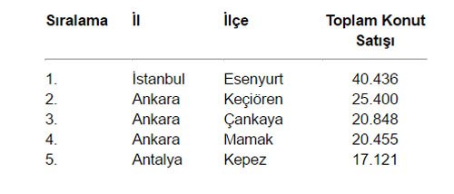 Yapılan araştırmaya göre, Ankara’nın Keçiören ilçesindeki konut satışları bir önceki yıla göre %3 artış göstererek 25 bin 400 adede ulaştı. Çankaya ve Mamak ilçelerinde ise bir önceki yıla göre konut satışları sırasıyla, %6 ve %2 oranında artış göstermiştir. Yabancı yatırımcılar için çekim merkezi olan Antalya’nın Kepez ilçesinde ise %4 artış yaşanmıştır. Böylece en fazla konut satışı gerçekleşen ilk 5 ilçe sıralamasında 3 ilçe Ankara’da yer almıştır.