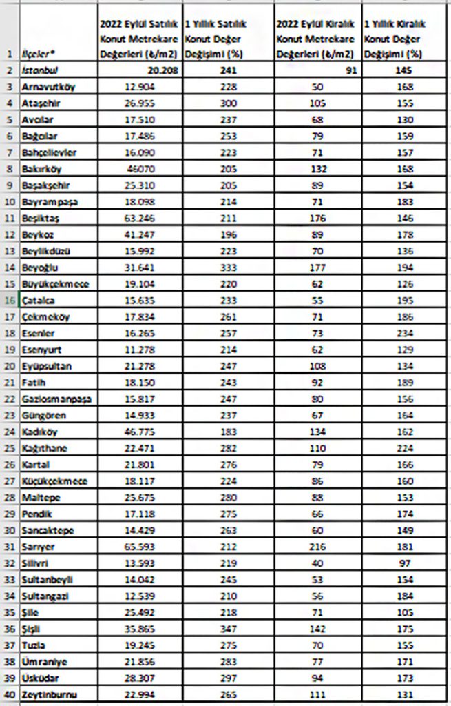Eylül sonu verilerine göre, İstanbul’da konut satış fiyatlarında yıllık değer artışı %241 seviyesinde gerçekleşirken, ortalama konut metrekare satış fiyatı 20 bin 208 TL, ortalama konut fiyatı 2 milyon 424 bin 960 TL ve konut yatırımının geri dönüş süresi 19 yıl oldu. İstanbul’da yıllık değer artışı en yüksek ilçeler ise sırasıyla Şişli, Beyoğlu, ve Ataşehir oldu.
