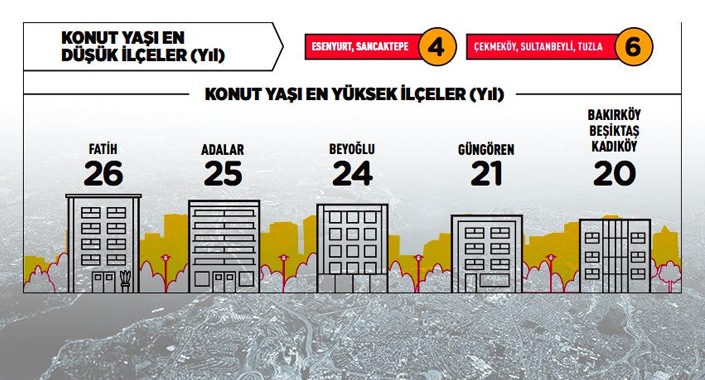 En genç konutların bulunduğu yerleşim yerlerinin başında ortalama 4 yıl ile Esenyurt ve Sancaktepe gelirken, yaş ortalaması Arnavutköy, Çekmeköy, Sultanbeyli ve Tuzla’da 6 yıla, Eyüp, Başakşehir ve Ümraniye’de 7 yıla, Pendik, Beylikdüzü ve Kağıthane’de 8 yıla, Sultangazi, Küçükçekmece ve Ataşehir’de 9 yıla, Bağcılar, Gaziosmanpaşa ve Çatalca’da 10 yıla, Sarıyer, Büyükçekmece, Esenler, Şile ve Kartal’da 11 yıla çıkıyor.