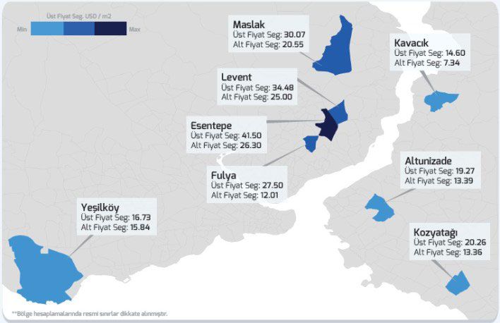 Endeks verileri, ilçe ve mahalle resmi sınırları kullanılarak hesaplanan metrekare kira değerleri baz alınarak oluşturuldu. Reidin, yüksek ofiskira gelirine sahip semtin yine Esentepe olduğunu saptadı. Esentepe’de üst fiyat segmentinde metrekare değerleri, 41,50 dolar, alt fiyat segmentinde ise 26,30 dolar olarak saptandı. En düşük kira gelirine sahip bölgelerde ise, üst fiyat segmentinde 14,37 dolar ile Kartal, alt fiyat segmentinde ise 6,65 dolar ile Pendik öne çıktı.