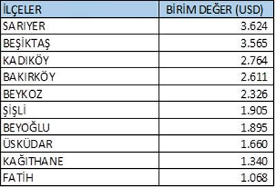 İstanbul’un en pahalı ilçelerinden olan Sarıyer, Beşiktaş, Kadıköy, Bakırköy, Beykoz, Şişli, Beyoğlu, Üsküdar, Kağıthane ve Fatih’te 1 m2 konut almanın maliyeti aşağıdaki tabloda özetlenmiştir.
