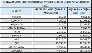 2021 yıl sonu verilerine göre incelenen ülkelerin gayri safi yurt içi hasıla verileri