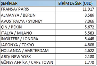 Eva Gayrimenkul Değerleme Uzmanı Anıl Ünlü, dünyada şehirler arasında en yüksek birim fiyatının 11.917 USD ile Fransa’nın Paris kentinde olduğunu belirterek, Paris’in ardından Berlin ve Sydney geliyor. Araştırılan şehirlerden en düşük birim fiyata sahip olan ise Güney Afrika’da yer alan Cape Town oldu.