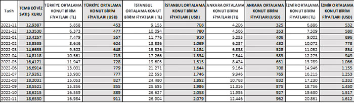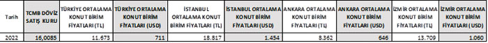 12 Aylık ortalamaya göre rakamlar incelendiğinde; Türkiye’de 1 m2 konut edinmenin maliyeti 11.673 TL / 711 USD, İstanbul’da 18.817 TL / 1.454 USD, Ankara’da 8.362 TL / 646 USD, İzmir’de ise 13.709 TL / 1.060 USD olmuştur.
