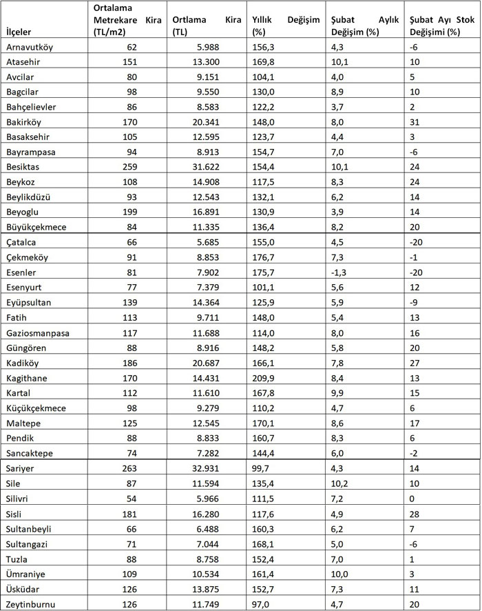 Şubat ayında kira değeri en fazla artan ilçeler Şile, Beşiktaş, Ataşehir ve Ümraniye olurken en az artış görülen ilçeler Avcılar, Beyoğlu ve Bahçelievler oldu. Esenler’de ise kiralar düşüş gösterdi. Kiralanmayı bekleyen konut stoku en fazla artan ilçeler Bakırköy, Şişli, Kadıköy, Beşiktaş, Beykoz; kiralık stoku en fazla düşüş gösteren ilçeler ise Eyüpsultan, Çatalca ve Esenler oldu.