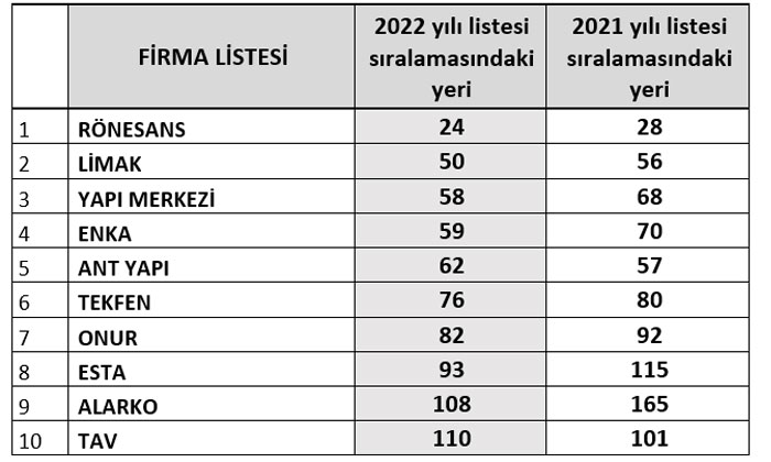 Listedeki 10 firmadan 8’i, 2021 yılına göre sıralamadaki yerini daha yukarı taşırken sadece nisbî olarak 2 firma geriledi. Alarko, geçtiğimiz yıl bulunduğu 165. sıradan 108. sıraya gelerek büyük bir sıçrama yaptı.