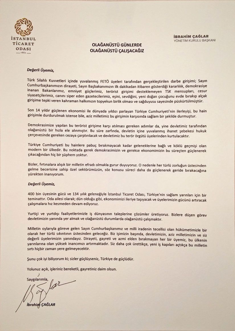 İstanbul Ticaret Odası Başkanı İbrahim Çağlar 400 bin üye firmasında olağanüstü çalışma temposu istedi. Üyelerine hitap ettiği mektupla Fetullahçı Terör Örgütü’nün (FETÖ) darbe girişiminin püskürtülmesinin ardından ‘milli birlik’ ve ‘ülke için üretim’ çağrısı yapan Çağlar, “Olağanüstü günlerde, olağanüstü çalışacağız” dedi.