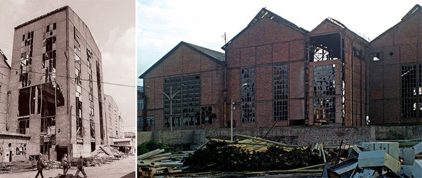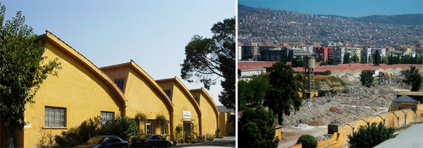 Soldaki fotoğraf: Elektrik Fabrikası (Sinan Akyurtlaklı / Mimarlar Odası İzmir Şubesi), Sağdaki fotoğraf: Elektrik Fabrikası (Ahmet Giliz / Mimarlar Odası İzmir Şubesi Arşivi)