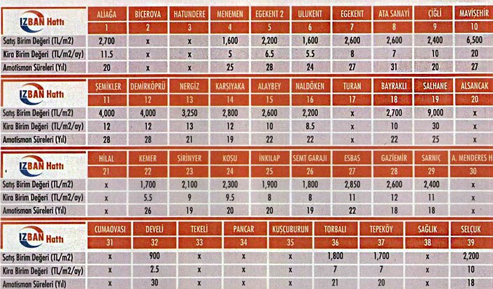 En düşük m2 satış fiyatına sahip duraklar ise 900 TL ile İZBAN hattındaki Develi ve bin 600 TL ile de yine İZBAN hattındaki Menemen ve Ulukent durakları olarak ortaya çıktı.