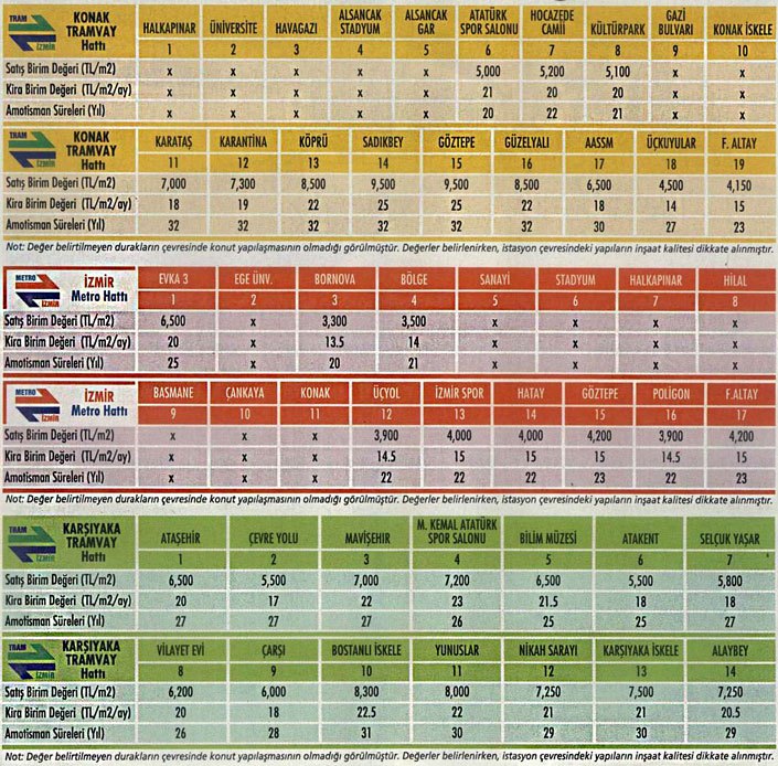 Çalışmanın sonuçlarına göre, en yüksek aylık m2 kira değerine sahip duraklar ise 30 TL ile İzmir İZBAN hattındaki Salhane durağı, 25 TL ile de Konak tramvay hattındaki Sadıkbey ve Göztepe durakları olarak görülüyor. En düşük aylık m2 kira değerine sahip durakların da 2,5 TL ile İzmir İZBAN hattındaki Develi ve 14 TL ile Konak tramvay hattındaki Üçkuyular olduğu dikkati çekiyor.