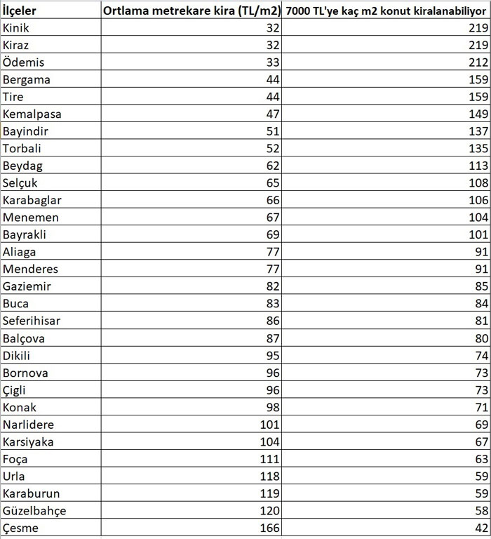 İzmir’de 7 bin TL’ye Ödemiş’ten 212 m2, Kemalpaşa’dan 149 m2, Bergama’dan 159 m2, Bayındır’dan 137 m2, Karabağlar’dan 106 m2, Menemen’de 104 m2, Aliağa’dan 91 m2, Menderes’te 91 m2, Gaziemir’de 85 m2, Dikili’de 74 m2, Bornova’da 73 m2, Karşıyaka’da 67 m2 daire kiralamak mümkün.