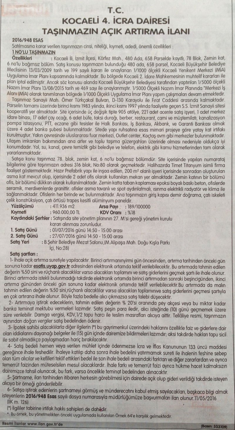 Tahmini fiyatı 960 bin lira olarak belirlenen taşınmazın satışı 1 Temmuz 2016 tarihinde saat 14. 50’de Mehmet Ali Paşa Mahallesi Doğu Kışla Parkı içi No 28’deki Büyükşehir Belediyesi Mezat Salonu’nda gerçekleştirilecek. Taşınmaza talipli çıkmadığı takdirde 27 Temmuz 2016 tarihinde aynı yer ve saatte satış tekrarlanacak.