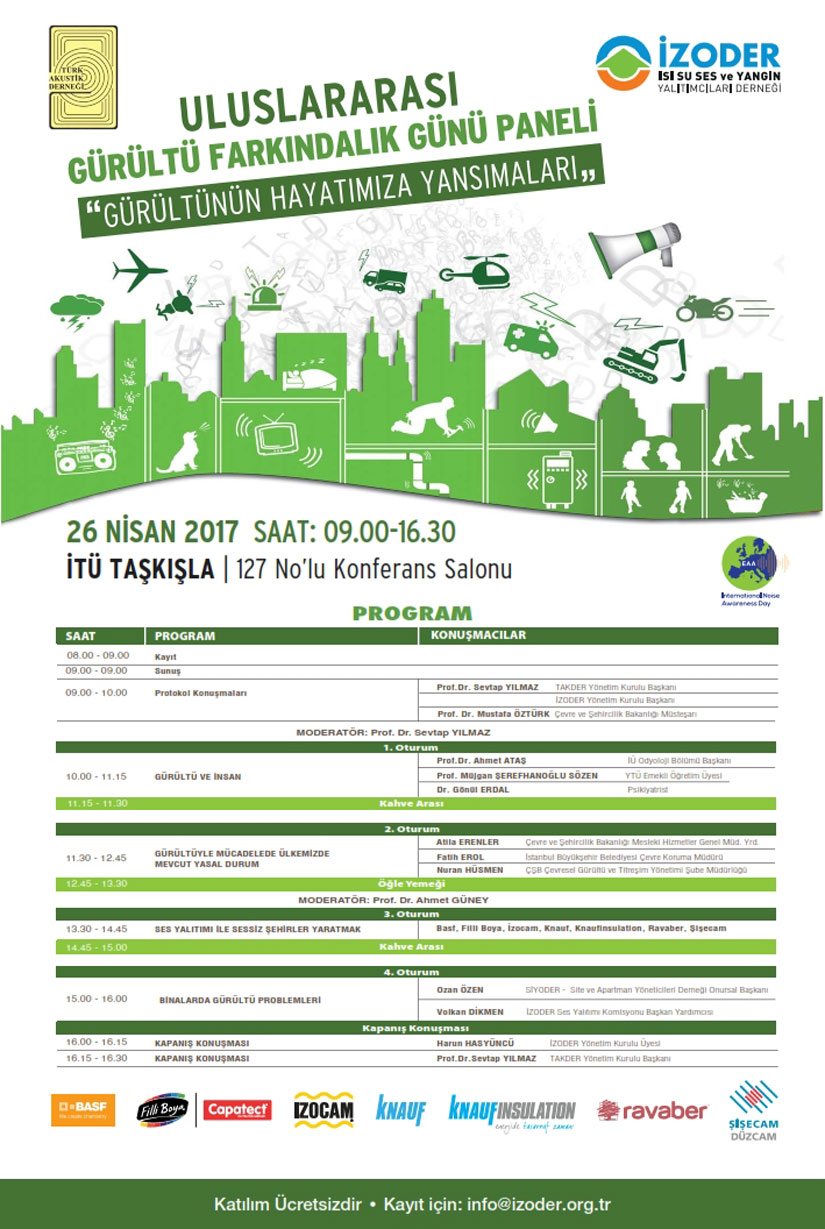 Uluslararası Gürültü Farkındalık Günü’ kapsamında, 26 Nisan 2017 günü TAKDER ve İZODER işbirliği ile İstanbul İTÜ Taşkışla’da ’da etkinlik düzenlenecek. Tüm gün sürecek etkinlikte, alanında uzman isimlerin katılımıyla gürültünün hayatımıza etkileri konulu paneller yapılacak.