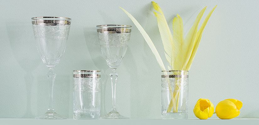 Platin dekorlu, floral ve yalın desenleri bir araya getirerek eğlenceli ve zarif bir tarz oluşturan Bohem bardak takımları çay, meşrubat, su bardağı ve farklı boy kadehlerden oluşan 6’lı setler halinde satılıyor.