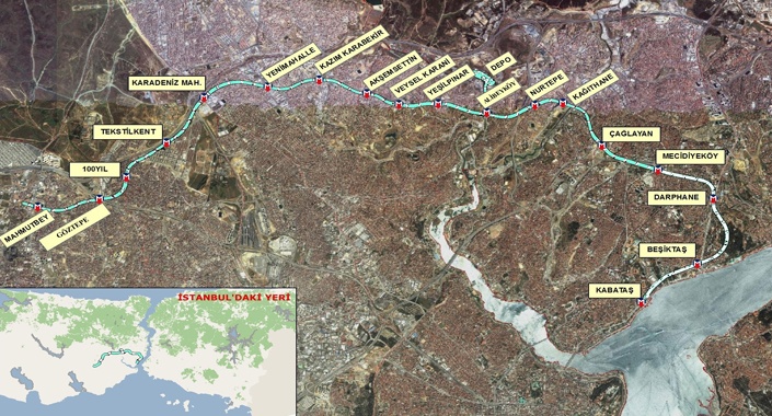 İstasyonlar: Kabataş, Beşiktaş, Yıldız, Fulya, Mecidiyeköy, Çağlayan, Alibeyköy, Çırçır Mahallesi, Veysel Karanı – Akşemsettin, Yeşilpınar, Kazım Karabekir, Yeni Mahalle, Karadeniz Mahallesi, Tekstilkent- Giyimkent, Yüzyıl, Oruç Reis, Göstepe Mahallesi, Mahmutbey.