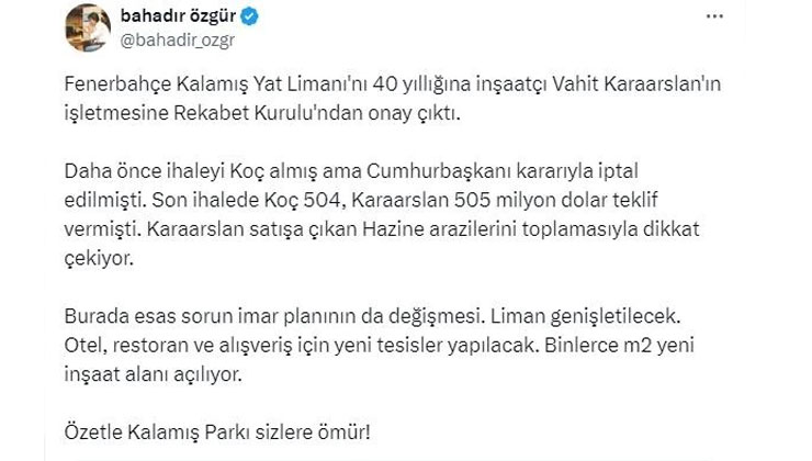 “Fenerbahçe Kalamış Yat Limanı’nı 40 yıllığına inşaatçı Vahit Karaarslan’ın işletmesine Rekabet Kurumu’ndan onay çıktı. Daha önce ihaleyi Koç almış ama Cumhurbaşkanı kararıyla iptal edilmişti. Son ihalede Koç 504, Karaarslan 505 milyon dolar teklif vermişti. Karaarslan satışa çıkan Hazine arazilerini toplamasıyla dikkat çekiyor. Burada esas sorun imar planının da değişmesi. Liman genişletilecek. Otel, restoran ve alışveriş için yeni tesisler yapılacak. Binlerce m2 yeni inşaat alanı açılıyor. Özetle Kalamış Parkı sizlere ömür!”