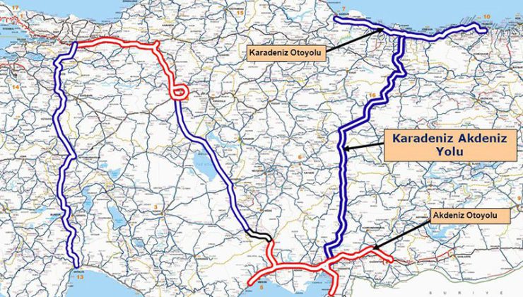Önümüzdeki yıl hayata geçecek Karadeniz ile Akdeniz’i birbirine bağlayacak Karadeniz-Akdeniz Yolu projesi, 28 tüneliyle 600 kilometre uzunluğunda olacak. Türkiye ihracatının alternatif pazarlara açılması açısından büyük önem taşıyan proje sayesinde, Rusya’ya yapılamayan narenciye ihracatı Ukrayna’ya Karadeniz üzerinden daha ucuz ve kolay yapılabilecek. İlk kez Osmanlı padişahı Sultan Abdülaziz döneminde dile getirilen, 2. Abdülhamid zamanında projesi çizilen 2017'de hizmete girecek Karadeniz-Akdeniz Yolu, Karadeniz'i İç Anadolu, Doğu Anadolu ve Akdeniz'in ticaret limanı yapacak.