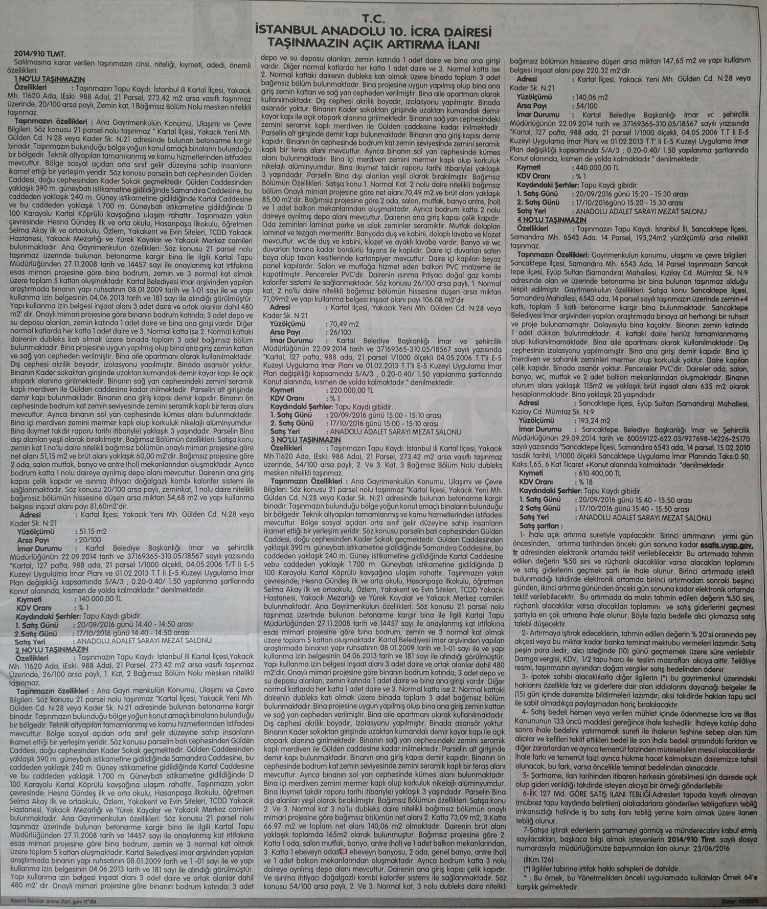 Kartal Yakacık Mahallesi’nde icradan satışa çıkarılan konutların 60-70 ve 140 metrekare kullanım alanları bulunuyor. Fiyatları 140 bin, 220 bin ve 440 bin lira olmak üzere toplam 800 bin lira olan konutların satışı 20 Eylül 2016 tarihinde saat 14.40’ta başlamak üzere Anadolu Adalet Sarayı Mezat Salonu’nda gerçekleştirilecek.