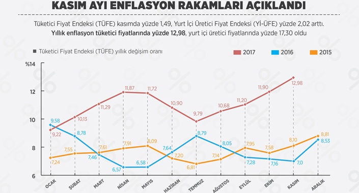 TÜFE, kasımda geçen yılın aralık ayına göre yüzde 11,16, geçen yılın aynı ayına göre yüzde 12,98 yükseldi. Yİ-ÜFE ise Aralık 2016’ya göre yüzde 13,91, Kasım 2016’ya kıyasla da yüzde 17,30 arttı.
