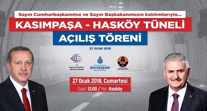 İstanbul trafiğine önemli bir soluk kazandıracak olan Kasımpaşa – Hasköy Tüneli Cumhurbaşkanı Recep Tayyip Erdoğan, Başbakanı Binali Yıldırım, Ulaştırma, Denizcilik ve Haberleşme Bakanı Ahmet Arslan, İstanbul Büyükşehir Belediye Başkanı Mevlüt Uysal ve halkın katıldığı törenle bugün hizmete açılıyor.