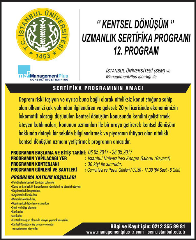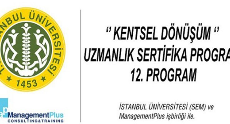 Management Plus ve İstanbul Üniversitesi (SEM) işbirliği ile düzenlenen “Kentsel Dönüşüm Uzmanlık Sertifika Programı” nın 12.’si 6 Mayıs’tan itibaren İstanbul Üniversitesi Beyazıt Kampüsünde başlıyor.