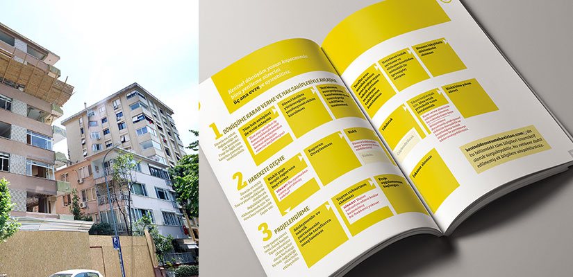 Proje dahilinde vatandaşlara ücretsiz olarak dağıtılacak olan 97 sayfalık Sarı Işık: Kentsel Dönüşüme Hazırlan Rehberi, Kadıköy’de yaşayan vatandaşlardan alınan görüşler ışığında hazırlandı. Kentsel dönüşümün tanımından, ilgili kanunlara, sürece dahil olan kamu ve özel sektör temsilcilerinin görev ve sorumluluklarından, projelendirme, sözleşme aşamalarına kadar kentsel dönüşüm sürecinin tüm aşamalarını özetleyen rehber, www.kentseldonusumehazirlan.com internet sitesinde de yayımlanıyor. İstanbulSMD üyesi mimarların ve konusunda uzman teknik insanların katkılarıyla hazırlanan Sarı Işık: Kentsel Dönüşüme Hazırlan Rehberi, kritik karar noktaları için vatandaşları hakları ve sorumlulukları konusunda önceden bilgilendiriyor.