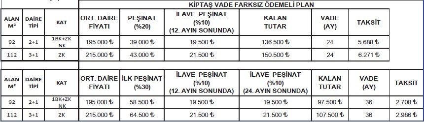 1- Firma bünyesinde yüzde 20 peşinat ile kalan yüzde 80’lik kısmın yüzde 10’luk bölümünü 12. ay sonunda ilave peşinat olarak verip kalan kısım için vade farksız 24 ay taksit imkanı,