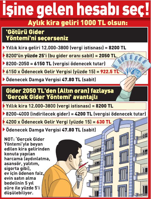 Kira gelirleri ‘Götürü gider’ ve ‘Gerçek gider’ olmak üzere iki türlü beyan edilebiliyor. ‘Gerçek gider yöntemiyle’ 2016’da ev için ısıtma, su, asansör, sigorta, onarım gibi yapılan masraflar, ev krediyle alınmışsa faiz, ev son 5 yıl içinde alındıysa tapu bedelinin yüzde 5’i gelirden düşülerek vergi hesaplanıyor. Kira döviz cinsinden ödeniyorsa kira gelir vergisi, bedelin tahsil edildiği tarihte geçerli olan Merkez Bankası döviz alış kuruna göre TL’ye çevrilerek hesaplanıyor.