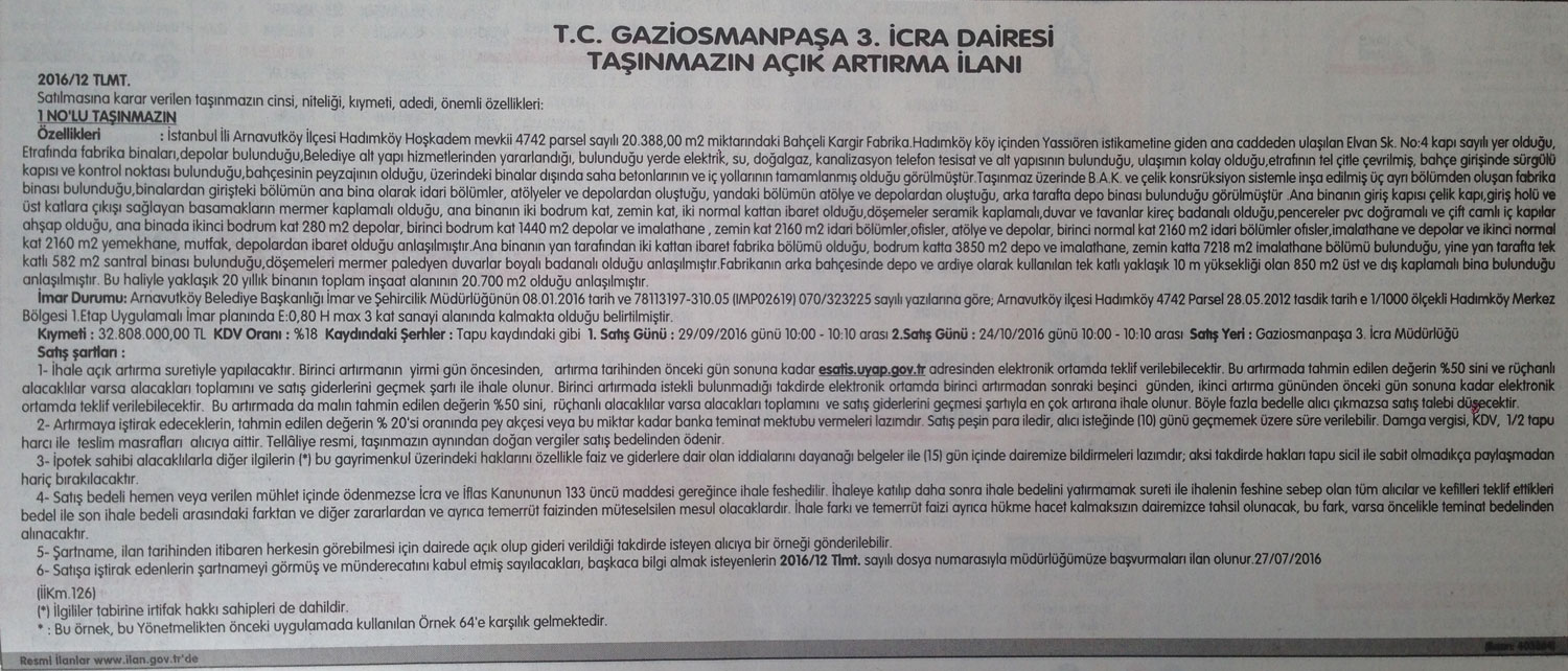 Asboya’nın icradan satışı 29 Eylül 2016 tarihinde saat 10.00’da Gaziosmanpaşa 3. İcra Müdürlüğü’nde gerçekleştirilecek. Alıcı çıkmadığı takdirde 24 Ekim 2016 tarihinde aynı yer ve saatte tekrarlanacak.