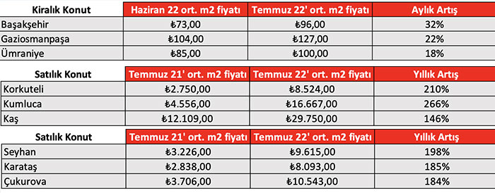 Haziran ayında kiralık konut m2 fiyatı en fazla artış gösteren il olan Kocaeli, Temmuz ayında da yüzde 13 oranıyla ilk sırada yer aldı. Yüzde 10 oranıyla Mersin ve İstanbul ikinci sırada yer alırken, yüzde 8 artışla Adana listeye üçüncü sıradan girdi. Türkiye genelinde 2021 yılının aynı dönemine göre kira oranları karşılaştırıldığında ise kiralık konutlarda yıllık en fazla yükselişi yüzde 256 oranla Tekirdağ oldu. Tekirdağ’ı yüzde 219 ile Kocaeli, yüzde 185 ile Mersin, yüzde 183 ile de Ankara ve Antalya takip etti.