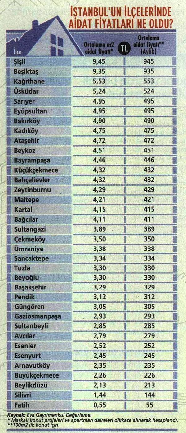Eva Gayrimenkul Değerleme’nin İstanbul genelinde yaptığı aidat araştırmasına göre, 100 metrekarelik daire için ortalama aylık aidat tutarı en yüksek fiyat 945 TL ile Şişli’de görülüyor. Onu 935 TL ile Beşiktaş, 553 TL ile Kağıthane, 524 TL ile Üsküdar, 495 TL ile Sarıyer izliyor.