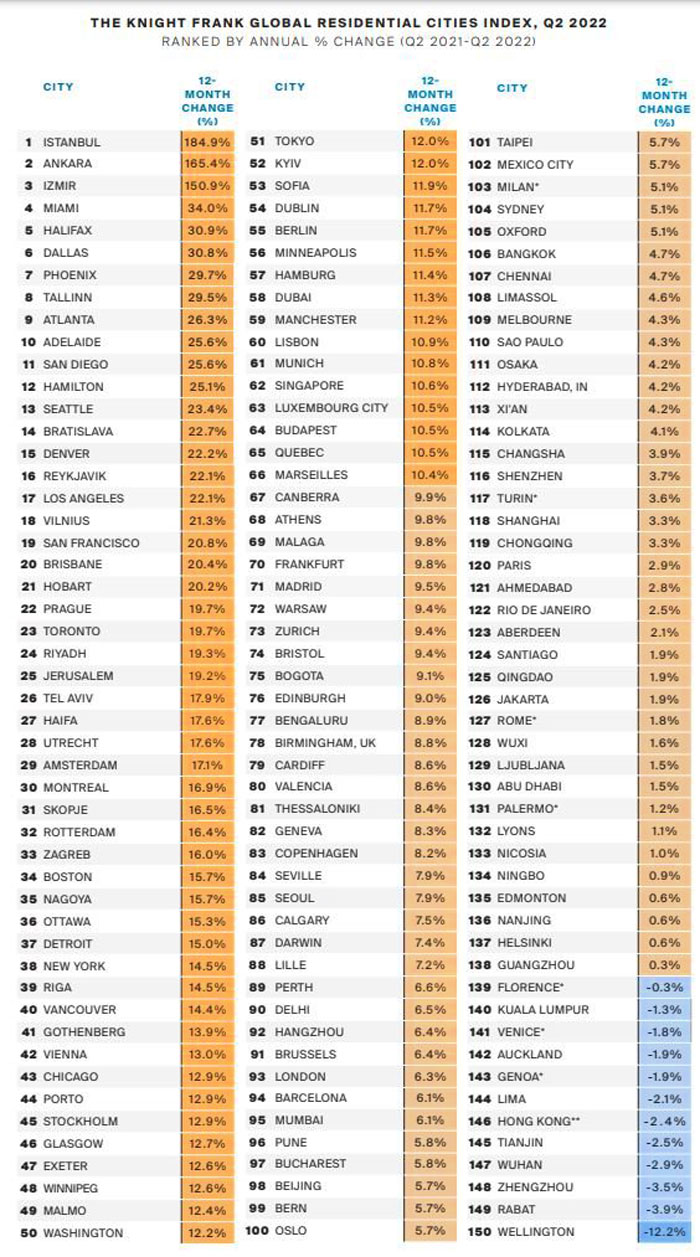 İngiltere merkezli küresel gayrimenkul danışmanlık şirketi Knight Frank, global konut fiyatları endeksi 2022 ikinci çeyrek sonuçlarını yayımladı.