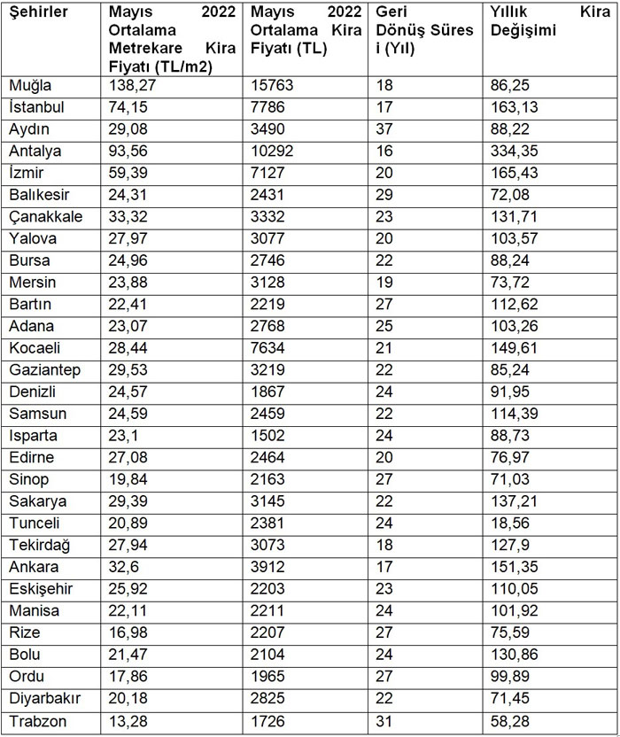 Türkiye genelinde kira bedeli en yüksek olan iller sırasıyla Muğla, Antalya ve İstanbul oldu. Muğla’da kiralarda yıllık değer artışı %86 seviyesinde, ortalama metrekare kira 138,27 TL, ortalama kira ise 15 bin 763 TL, geri dönüş süresi 18 yıl. Antalya’da kiralar son 1 yılda %334 artış gösterdi. Ortalama metrekare kira 93,56 TL, ortalama kira ise 10 bin 292 TL, geri dönüş süresi 16 yıl.