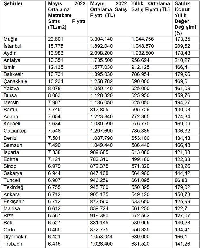 Yapılan araştırmalara göre Mayıs ayında ortalama metrekare konut satış fiyatına göre ilk 30 il değerlendirildiğinde yıllık değer artışı en yüksek olan iller ise sırasıyla Antalya, İstanbul ve Mersin oldu. Antalya’da konut fiyatları son bir yılda %210 artış gösterdi, ortalama konut metrekare satış fiyatı 13 bin 351 TL, ortalama konut satış fiyatı 1 milyon 735 bin 500 TL. İstanbul’da yıllık değer artışı %209, ortalama konut metrekare satış fiyatı 15 bin 775 TL, ortalama konut satış fiyatı 1 milyon 892 bin 040 TL. Mersin’de yıllık değer artışı %194, ortalama konut metrekare satış fiyatı 7 bin 907 TL, ortalama konut satış fiyatı 1 milyon 186 bin 050 TL. oldu.