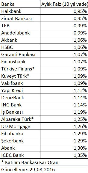15 Temmuz’daki darbe girişiminden önce aylık yüzde 1,17 – 1,49 bandına adeta demir atan ve aylarca bu seviyesini koruyan konut kredi faiz oranları, darbe girişiminin ardından Emlak Konut GYO’nun başlattığı kampanya ve Cumhurbaşkanı Recep Tayyip Erdoğan’ın bankalara yaptığı çağrılar üzerine düşme eğilimine girdi. Henüz beklenen oranda bir düşüş gösteremese de faiz oranlarının bazı bankalarda yüzde 1’in altına inmesi, daha yüksek indirim oranlarının habercisi olarak kabul ediliyor. 29 Ağustos itibariyle aylık yüzde 0,95- 1,35 aralığında bulunan konut kredisi faiz oranlarının önümüzdeki dönemde daha da düşmesi bekleniyor.