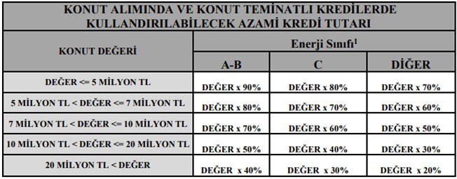 BDDK kararına göre kredi tutarının konut değerine oranı; konutun fiyatı ve enerji sınıfına göre kademeli olarak uygulanacak. Değeri 5 milyon TL’ye kadar olan A ve B enerji sınıfı konutlarda kredi oranı yüzde 90’a kadar çıkarken, bu oran daha yüksek değerli ve düşük enerji sınıfına sahip konutlarda kademeli olarak düşüyor.