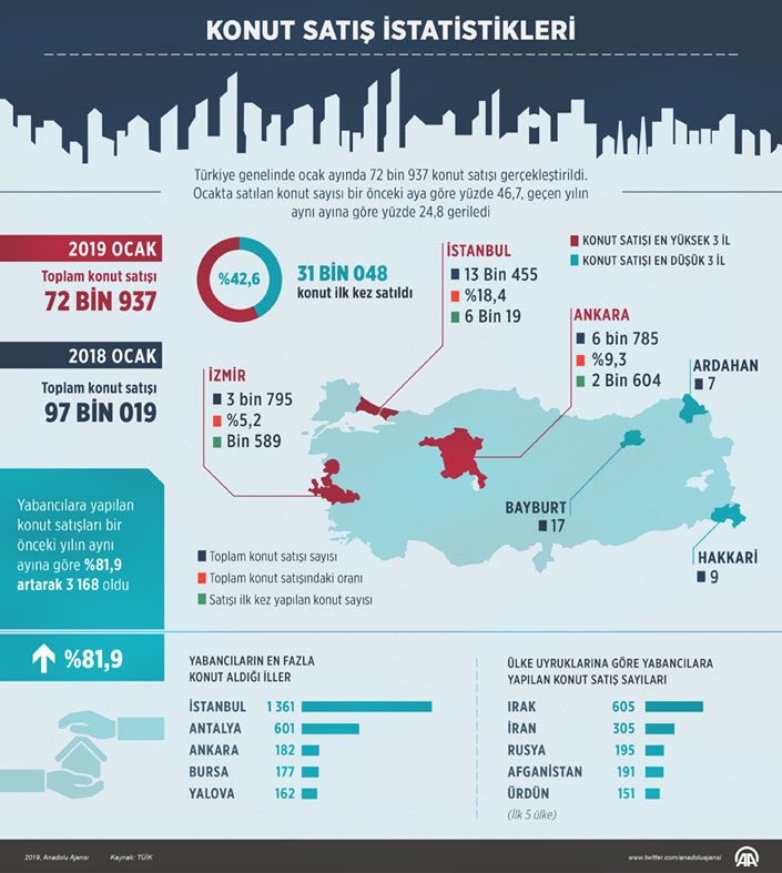 Bu alanda ilk sırada bin 361 konut satışıyla İstanbul bulunurken, bu ili 601 satışla Antalya, 182 satışla Ankara, 177 satışla Bursa ve 162 satışla Yalova izledi. Ocak ayında Irak vatandaşları Türkiye’den 605, İran vatandaşları 305, Rusya vatandaşları 195, Afganistan vatandaşları 191, Ürdün vatandaşları 151 konut edindi.