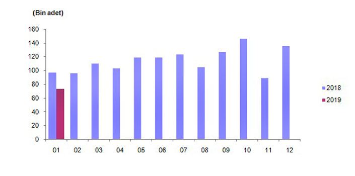 Buna göre, ülke genelinde ocakta satılan konut sayısı bir önceki aya göre yüzde 46,7, geçen yılın aynı ayına göre yüzde 24,8 azalarak 72 bin 937 oldu.