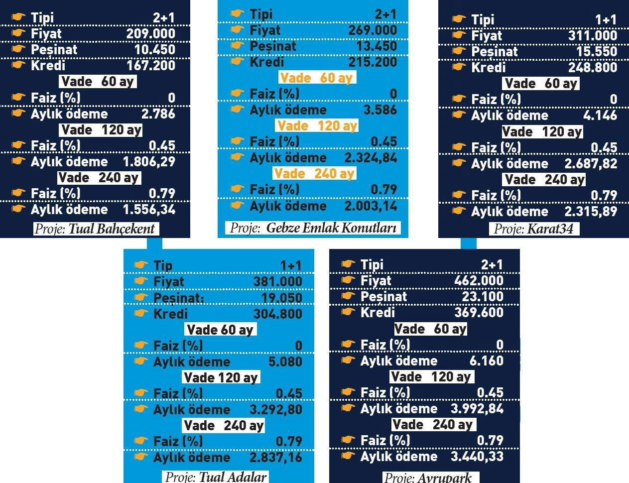 Buna göre, lüks bir konutun aylık ödeme taksitleri 240 ayda en düşük 1556 TL’den başlıyor. 209 bin liralık 1+1 konut için 10 bin 450 lira peşinat ödenmesi halinde aylık ödemeler 60 ayda 2 bin 786, 120 ayda ise 1806 lira oluyor. En çok talebin geldiği 2+1 dairelerde fiyatlar 269 bin TL’den peşinat tutarı 13 bin 450 TL olan bu daire için60 ay sıfır faizli aylık ödemede aylık taksiti 3 bin 586 TL, 120 aylık ödemede 2 bin 324 TL, 240 ayda ise 2 bin 3 TL oluyor.